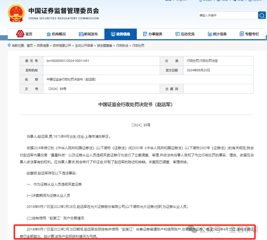 也就是说,该内幕消息不晚于2月22日,赵远军无疑是内幕知情人。但,就在2月25日、28日,赵远军使用“赵某江”证券账户合计买入星星科技160.16万股,涉资1142万,大约一年半后的8月18和19日卖出,最终亏损532.59万。