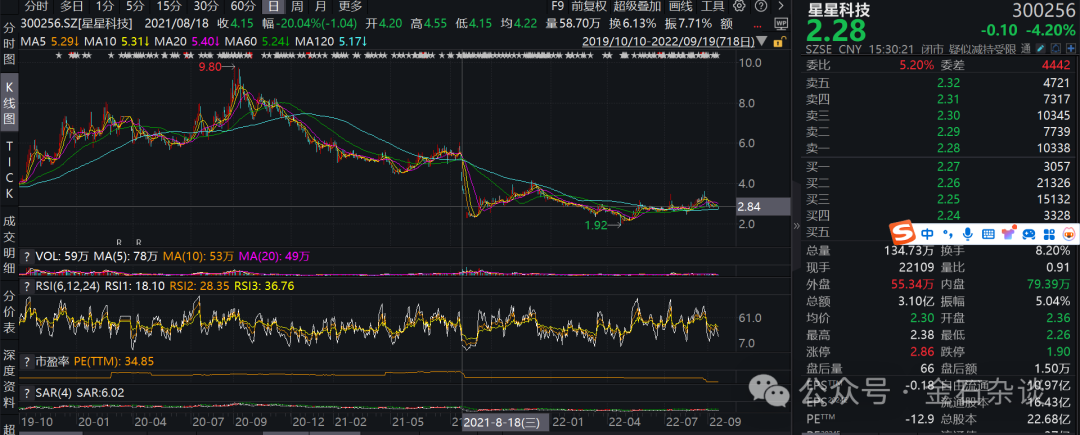 终止事项之后,星星科技持续阴跌。从21年开始,星星科技持续爆出负面消息,董事长辞职、持股5%以上股东减持、年报被问询(对公司业绩产生质疑)、董事轮番辞职、监事主席辞职等等。但是,直到21年8月在星星科技20cm跌停之际才选择了清仓抛售,最终持股亏损近50%,大号韭菜无疑。