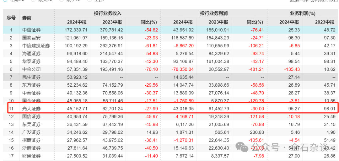 根据最新财报,光大证券在2024年上半年实现营收约42亿元,与去年同期相比下滑了32%;归母净利润则为13.91亿元,同比下滑41.87%。投行收入来看,光大证券投行收入下滑28%,投行业务利润下滑30%。